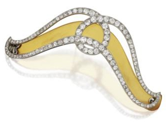 The barrette is by Cartier, circa 1905. In front, a setting of old European-cut diamonds weighs about 5 carats. Blonde tortoiseshell in back completes the piece. Price estimate: $10,000 – $15,000.
